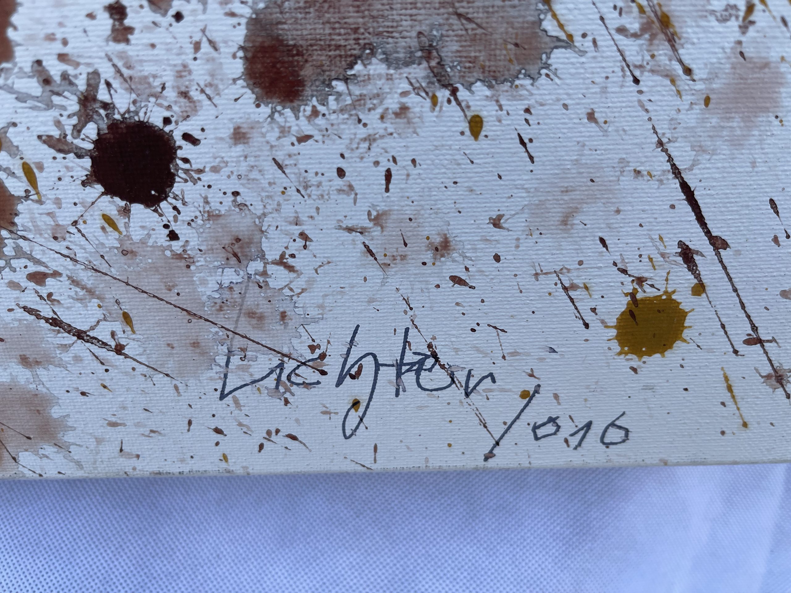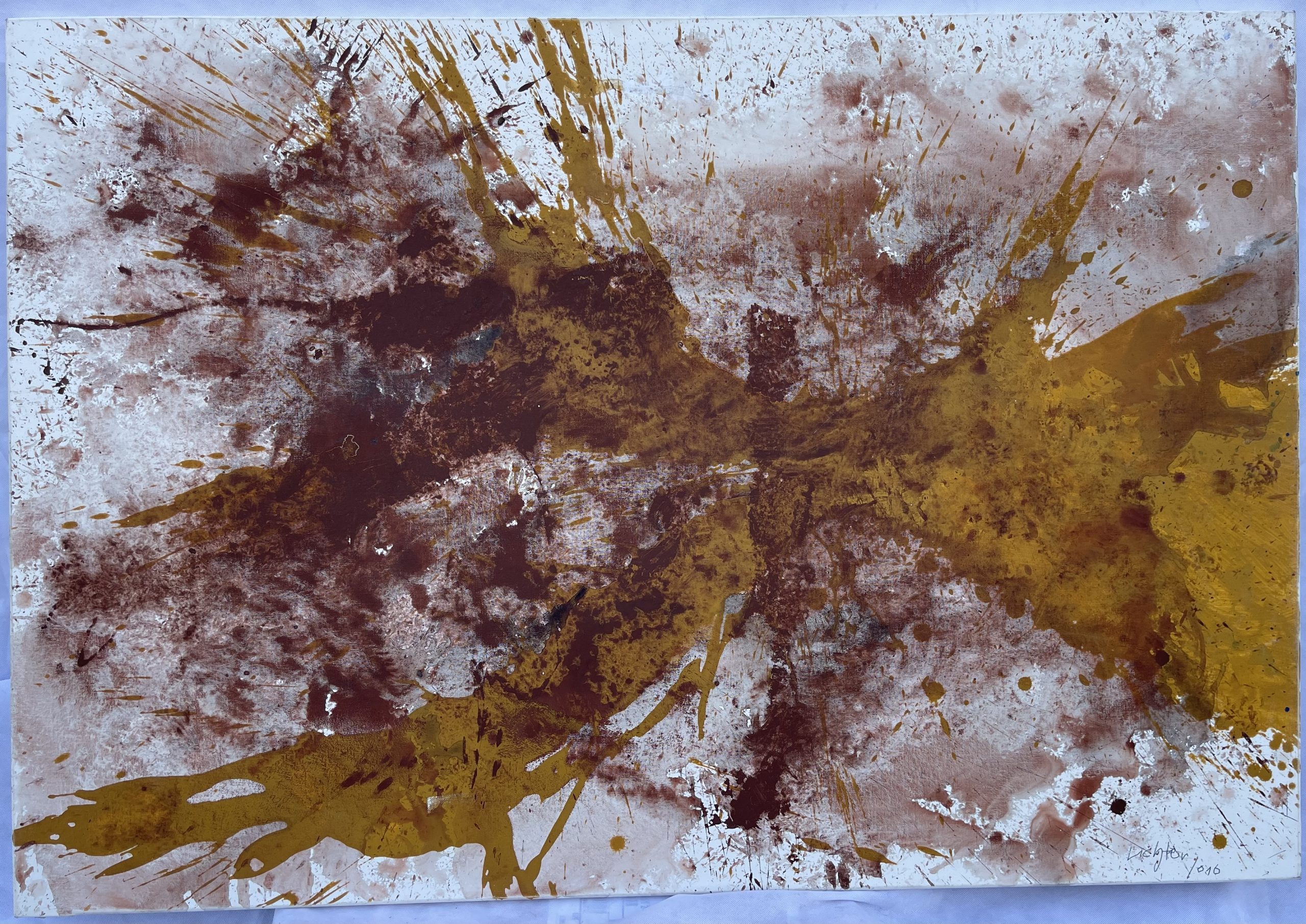 Ein abstraktes Gemälde in Braun und Gold im Stil von Robert Motherwell. Öl auf Leinwand, von 2010, 130 cm × 89 cm, signiert.