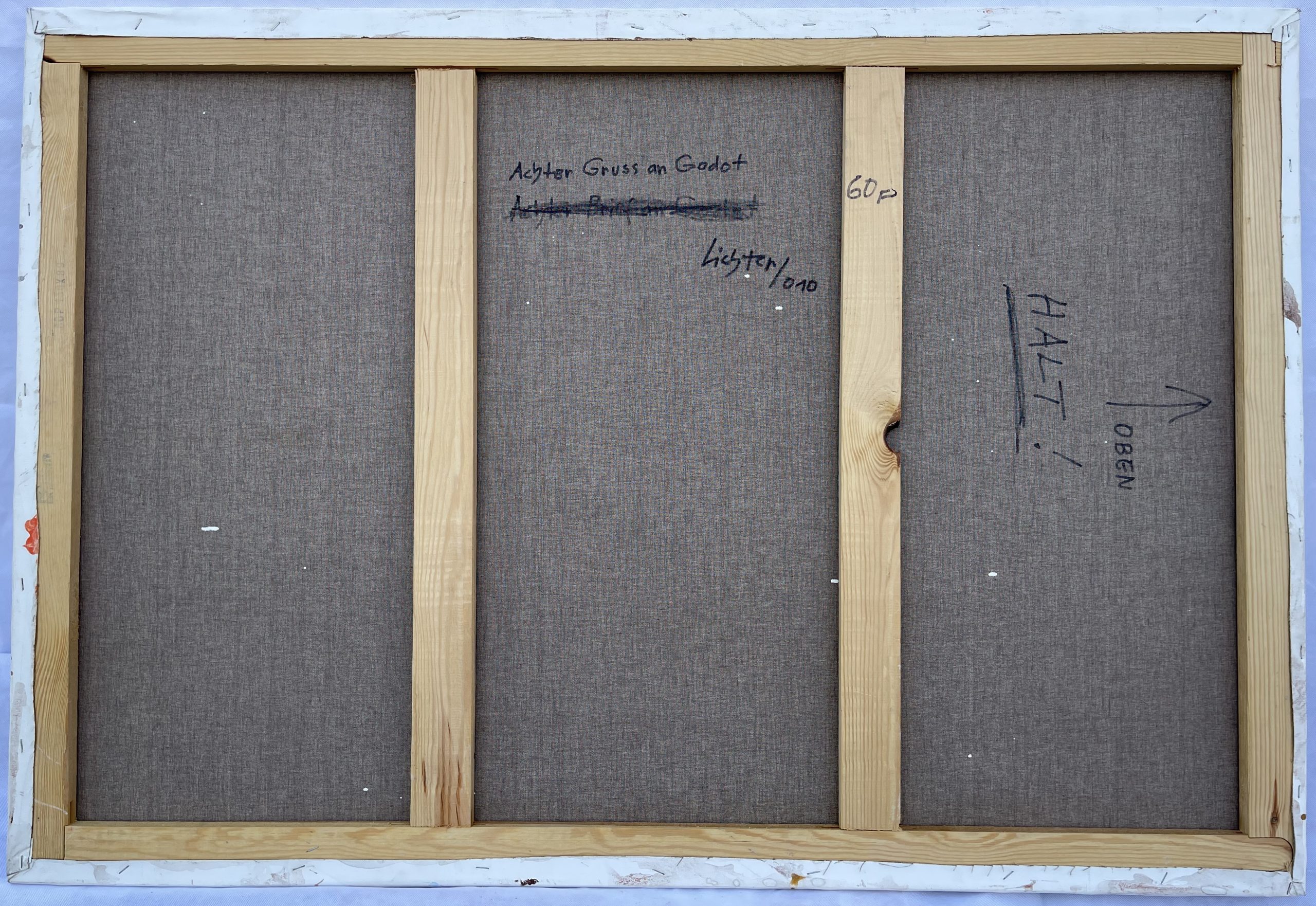 Im „Achten Gruß an Godot“ verbinden sich kräftige Farbkontraste mit einer fragmentierten Komposition, die an das Gefühl erinnert, kurz vor einem Wendepunkt zu stehen.
