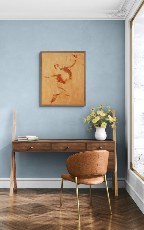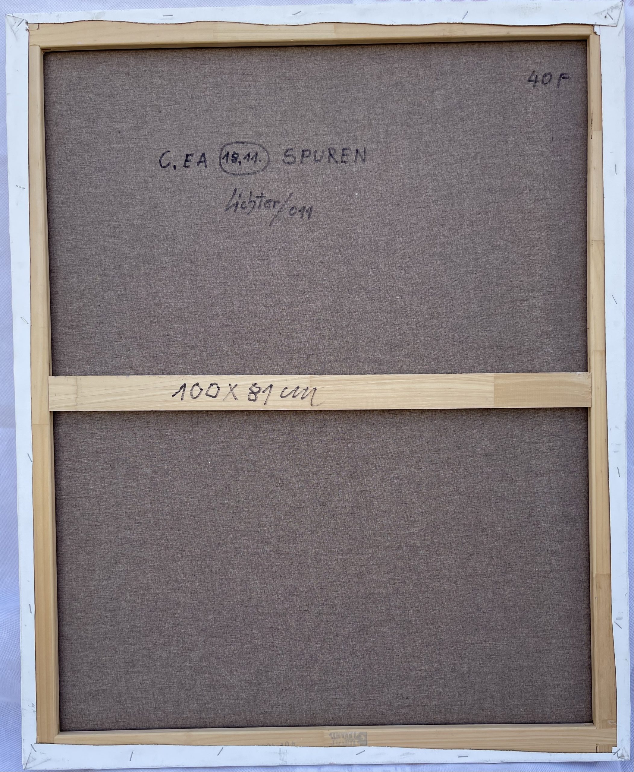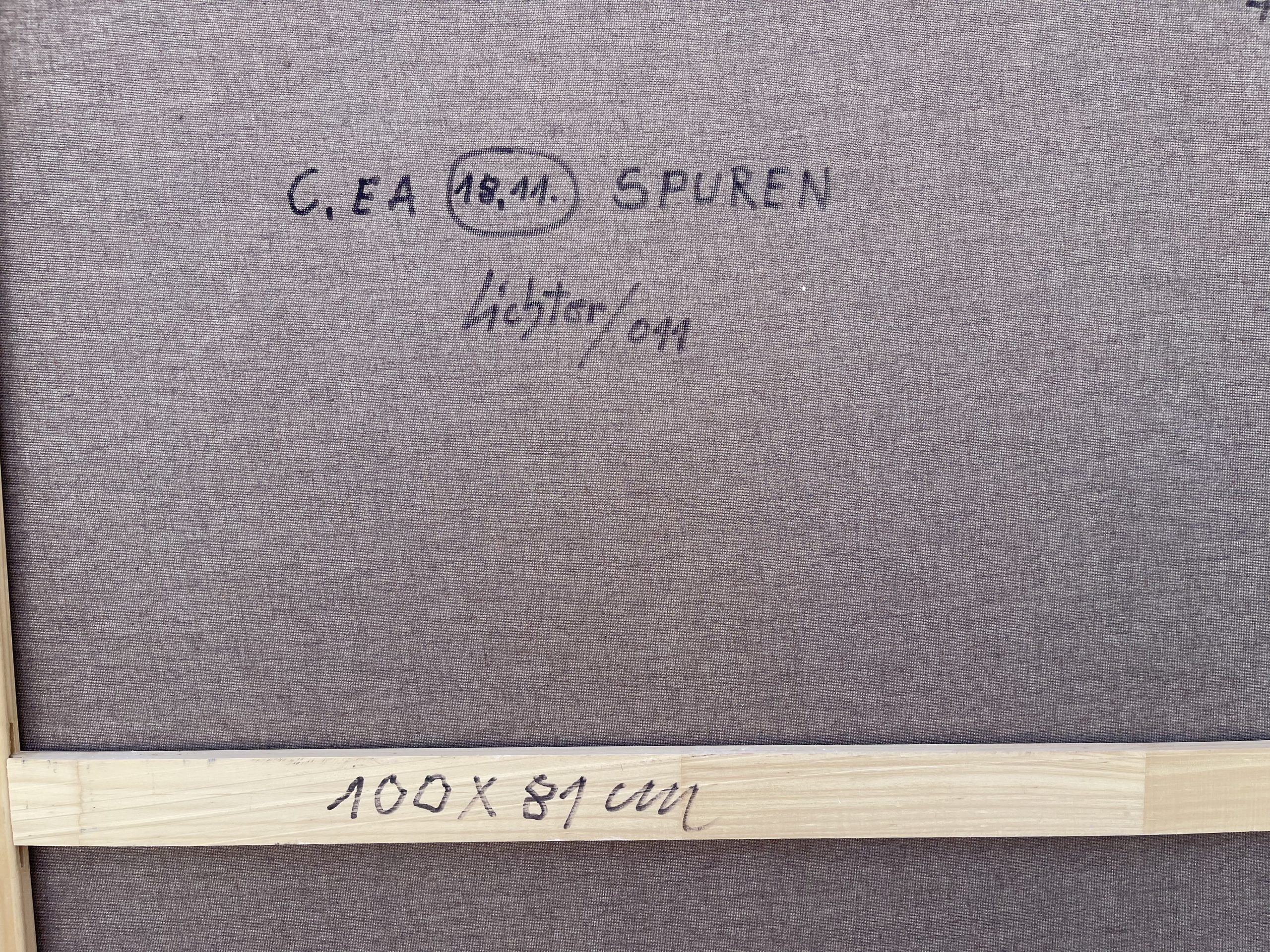 „Spuren C.EA. 18.11“ kombiniert lineare Bewegungen mit farbigen Akzenten – ein Dialog zwischen Zeichnung und Malerei. Dieses Gemälde entstand im Jahr 2011. Es hat eine Größe von 100 cm × 81 cm und wurde in Öl auf Leinwand erstellt. Es wurde vom Künstler signiert. Eine Zeichnung einer abstrakten weiblichen Figur in Bewegung, auf einem pfirsichfarbenen Hintergrund mit braunen Pinselstrichen, breiten und unordentlichen Linien.