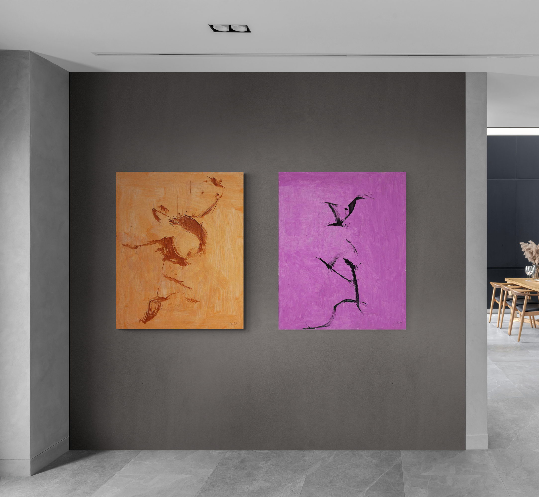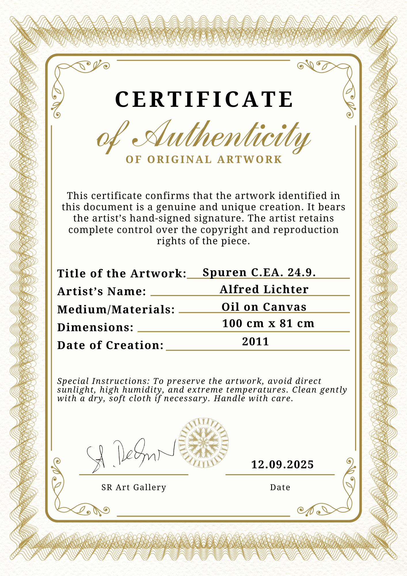 „Spuren 24.9“ greift das Motiv der Linie als Zeichen auf – mal abrupt, mal sanft, immer voller innerer Bewegung. Dieses Gemälde entstand im Jahr 2011. Es hat eine Größe von 100 cm × 81 cm und wurde in Öl auf Leinwand erstellt. Es wurde vom Künstler signiert. Ein minimalistisches Gemälde mit lila Hintergrund und schwarzen Pinselstrichen. Oben befindet sich eine abstrakte Form in Form von zwei Vögeln, die aufeinander zufliegen und ihre Schnäbel berühren. Das Gemälde zeichnet sich durch einfache Linien, dünne Striche und eine monochrome Palette aus.