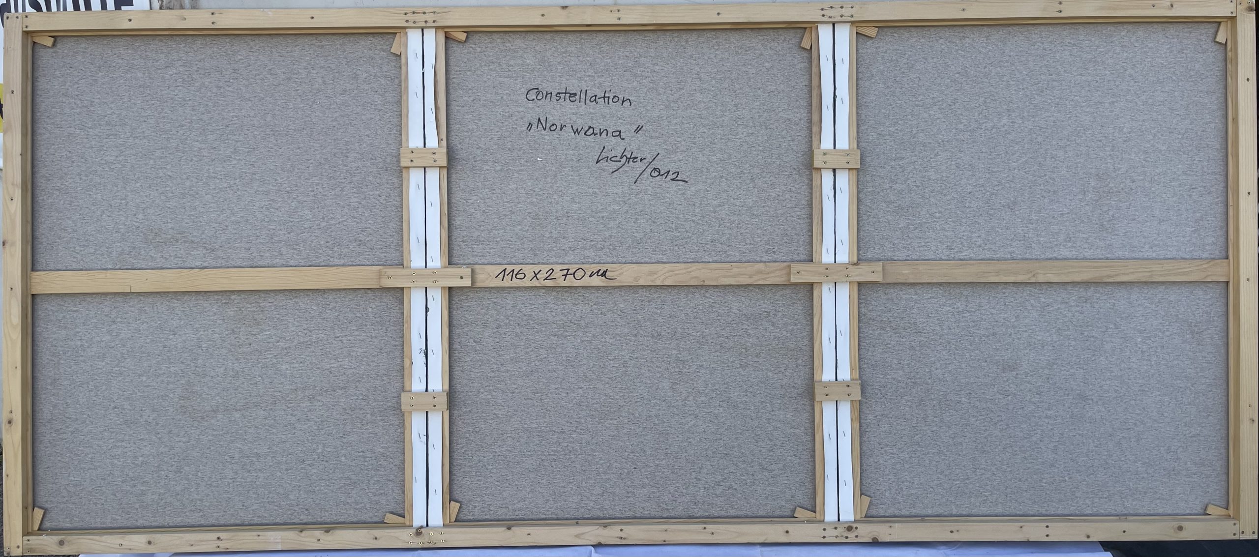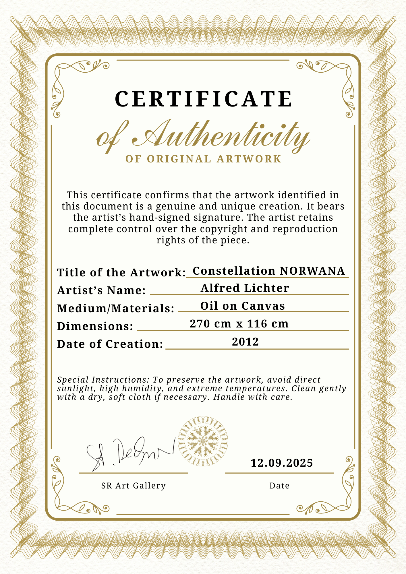 „Constellation Norwana“ zeigt Alfred Lichters Gespür für visuelle Dramaturgie. Der tiefgraue Hintergrund bildet die Basis, durchzogen von leuchtenden dunklen Bahnen, die wie Lichtspuren durch den Kosmos wirken. Das Werk strahlt Weite, aber auch eine innere Geschlossenheit aus – als ob der Betrachter einen Moment kosmischer Harmonie einfängt.