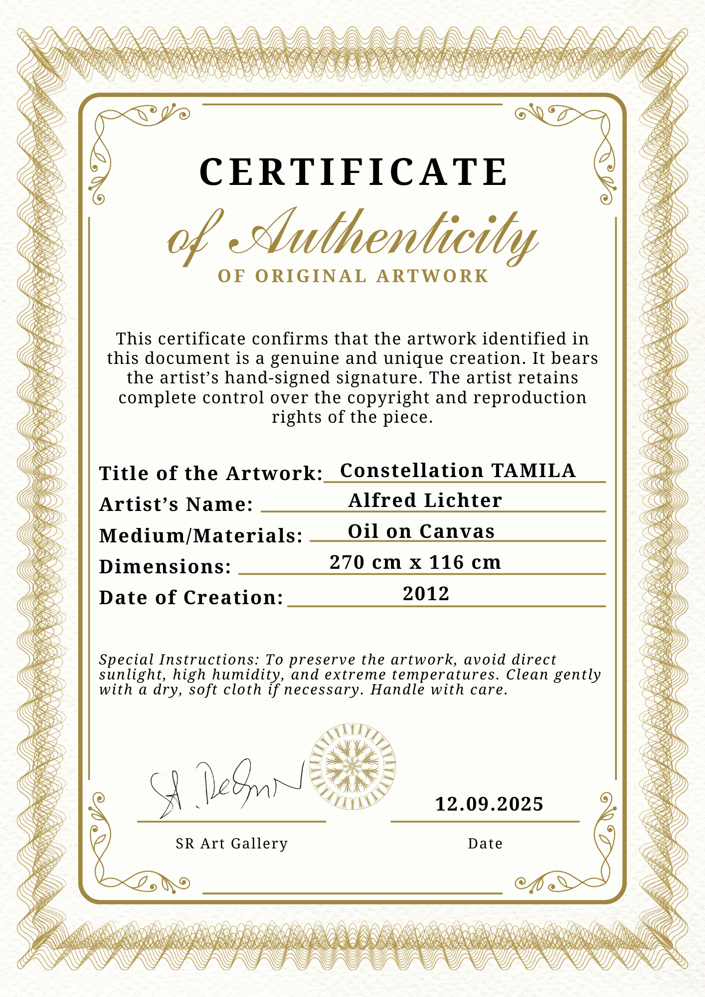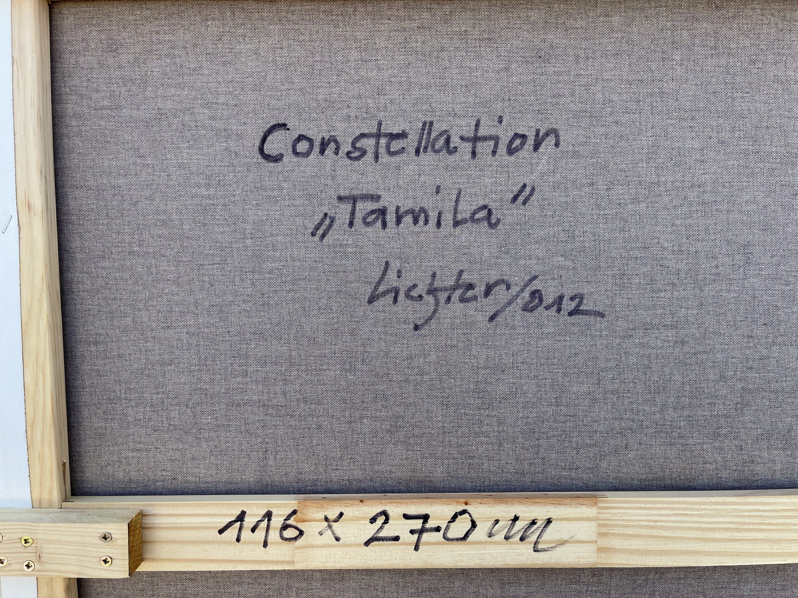 Mit „Constellation Tamila“ setzt Alfred Lichter ein kraftvolles Statement innerhalb seiner „Constellation“-Serie. Dominierend sind tiefe Rot- und Brauntöne. Diese Farbkomposition wirkt dynamisch und zugleich strukturiert, wodurch eine starke visuelle Spannung entsteht. Die klaren geometrischen Formen erinnern an Karten fremder Himmelsräume, während die warmen Farben Emotion und Energie ins Werk bringen.