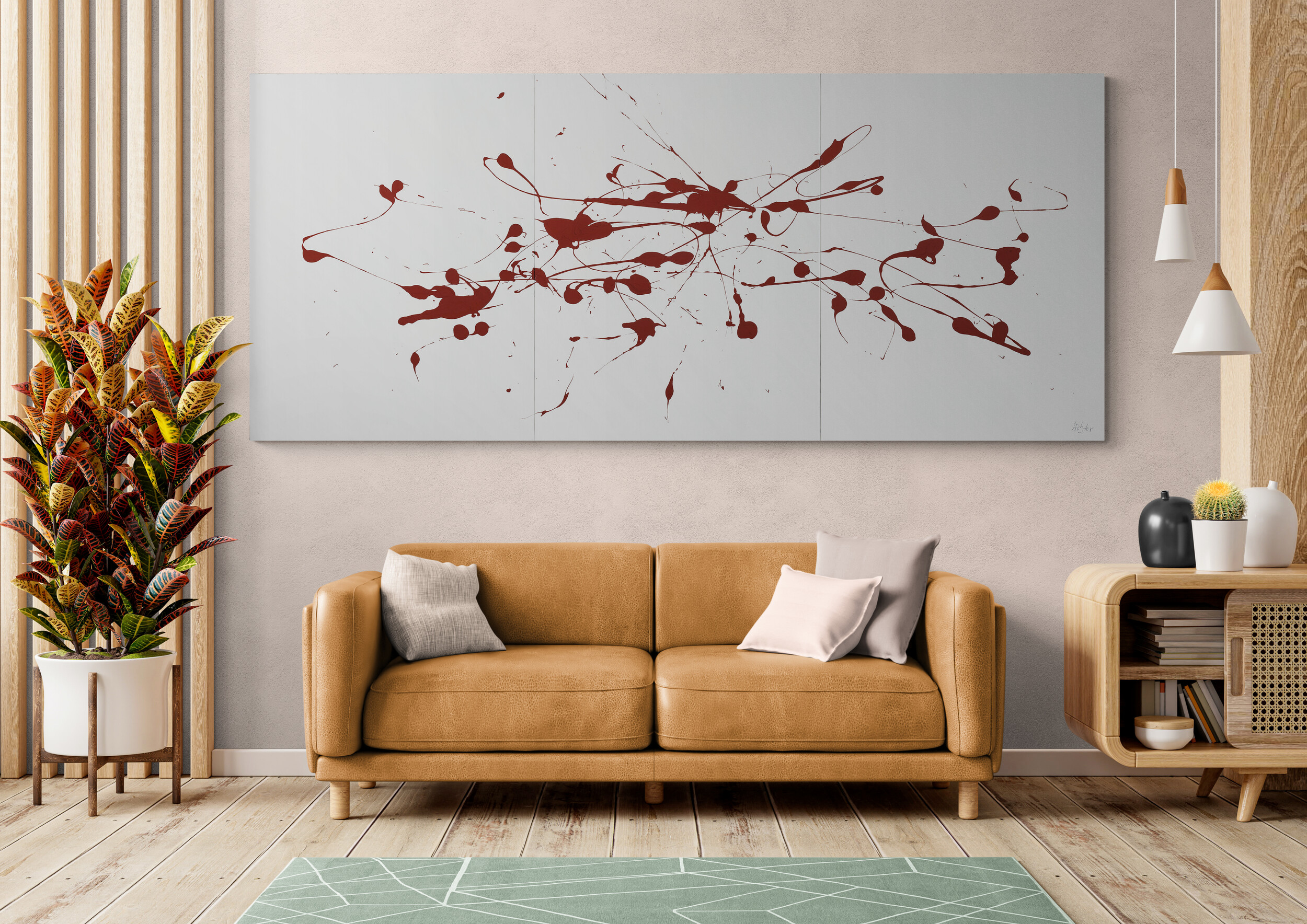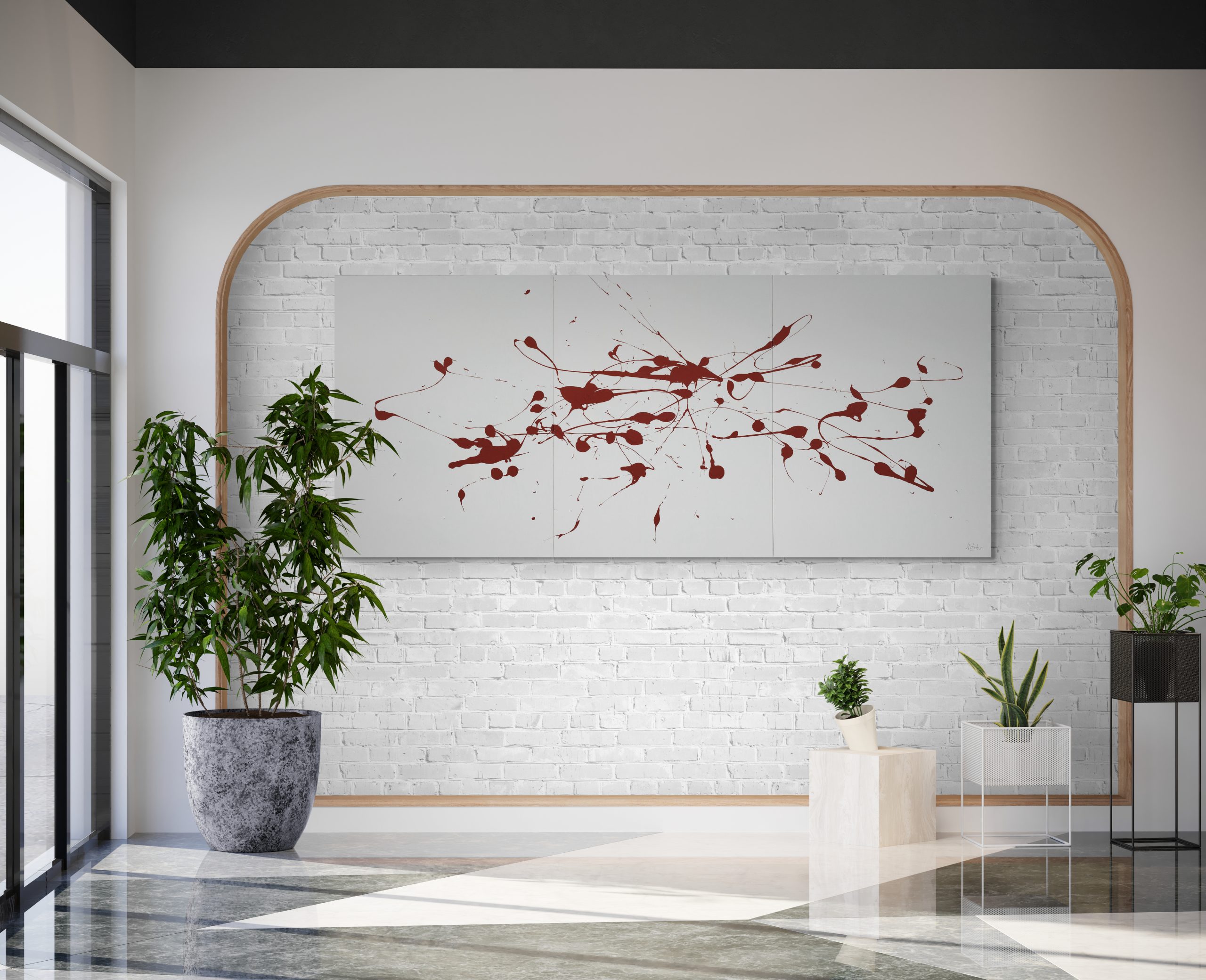 Öl auf Leinwand, signiert, original verfügbar – ein Sammlerstück, das in modernen Interieurs sofort zum Ankerpunkt wird. Durch seine kraftvolle, aber ausgewogene Farbdramaturgie eignet es sich besonders für repräsentative Räume, in denen es Sichtbarkeit und Charakter verleiht. Dieses Gemälde entstand im Jahr 2012, kurz vor dem Tod des Künstlers. Er war da bereits 95 Jahre alt. Es hat eine Größe von 270 cm × 116 cm. Es wurde vom Künstler handsigniert. Ein minimalistisches Gemälde mit Rot auf hellgrauem/weißem Hintergrund, gesprenkelt und in einer organischen Form angeordnet, die natürlichen Elementen wie Blättern oder Blumen ähnelt, die die Bewegung des Wassers durch die Zeit darstellen. Das Kunstwerk ist vom Minimalismus Robert Motherwells inspiriert, mit zarten Pinselstrichen, die Tiefe erzeugen und nur zwei Farben verwenden – dunkles Kastanienbraun für die flüssigen Formen und Hellgrau als Hintergrund. Es vermittelt ein Gefühl von Flüssigkeit und Bewegung.