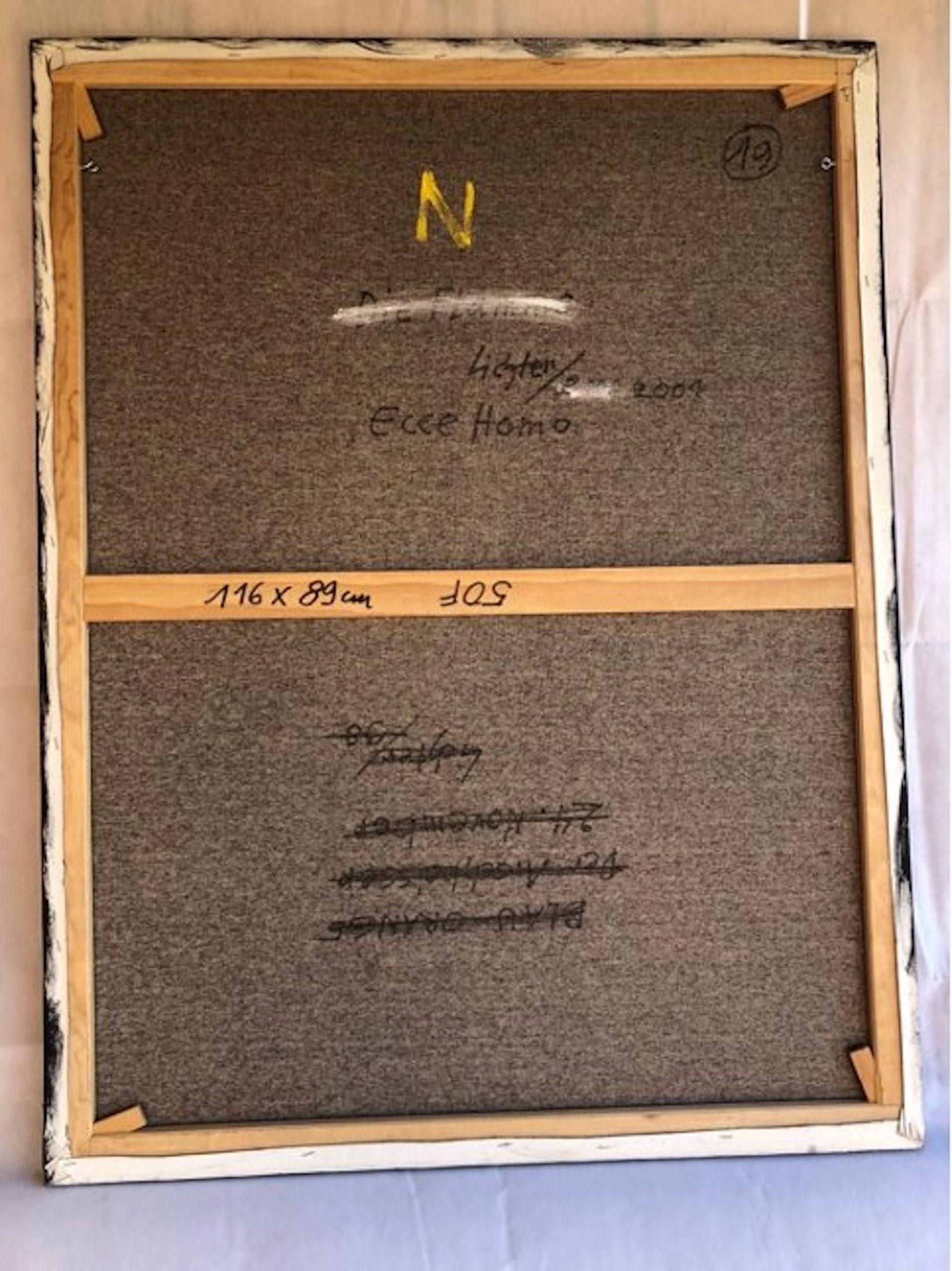 Öl auf Leinwand, signiert. Das Werk strahlt trotz der dramatischen Thematik eine gewisse Ruhe aus und lädt zur vertieften Betrachtung ein. Aus dem Jahr 2001. Signiert. Größe: 116cm × 89cm.