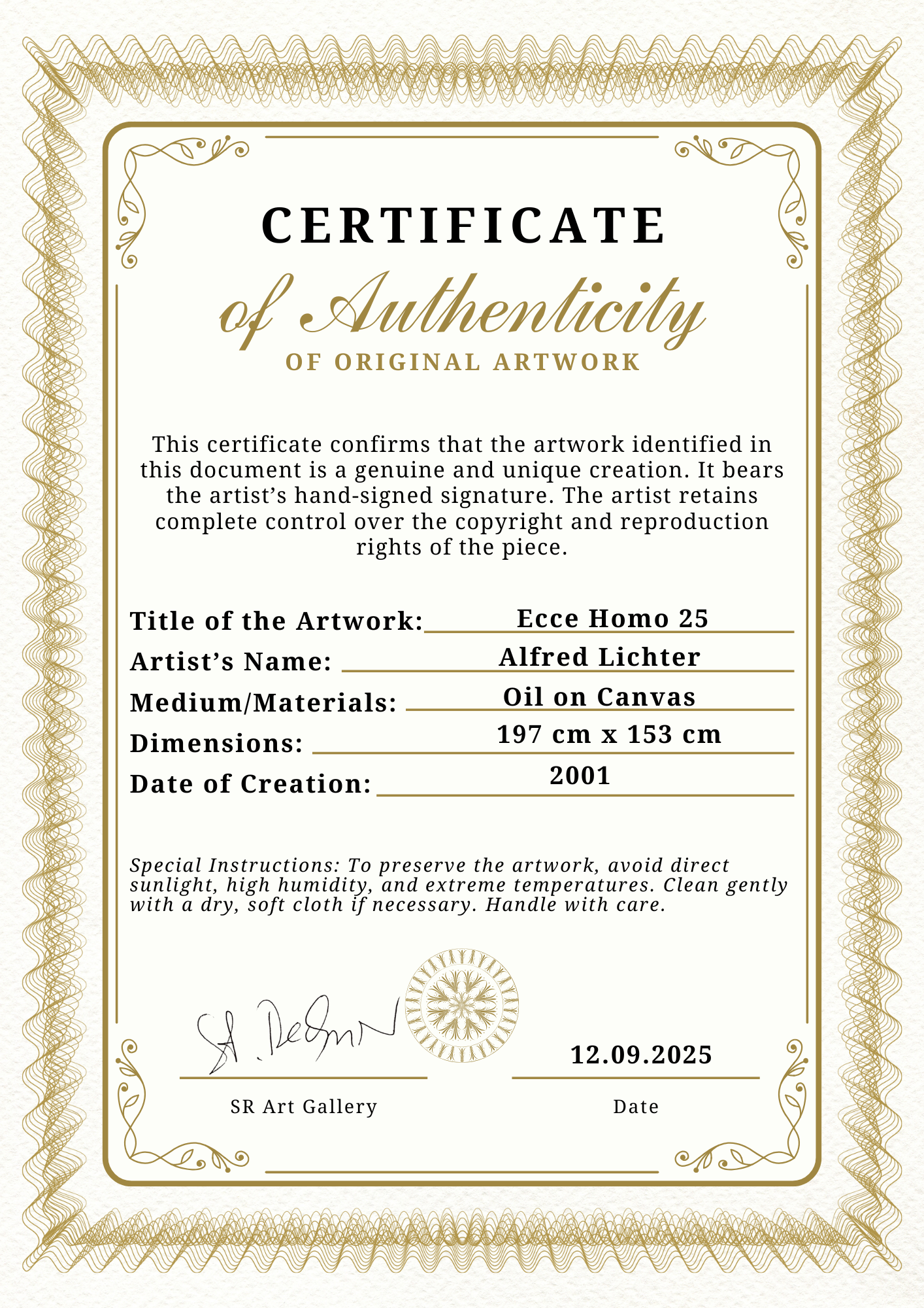 Diese Version im Format 197 × 153 cm aus Lichters Ecce-Homo-Reihe variiert die Farb- und Lichtführung: Sie ist heller, mit sanfteren Übergängen zwischen den Formen. Die Figur wird in einem fast atmosphärischen Licht inszeniert, das ihr eine spirituelle Ausstrahlung verleiht. Öl auf Leinwand, signiert. Ein Unikat, das trotz seiner Größe Leichtigkeit bewahrt. Aus dem Jahr 2001.