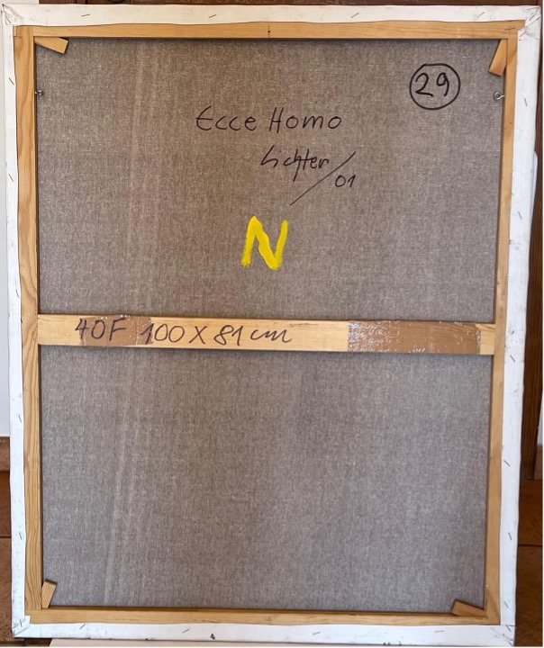 „Ecce Homo 29“ zeigt den Augenblick, in dem Schmerz und Mitgefühl in einem Blick verschmelzen. Feine Lichtreflexe modellieren das Gesicht, die Farbgebung verstärkt die spirituelle Strahlkraft. Öl auf Leinwand, signiert. Aus dem Jahr 2001. 100 cm × 81cm