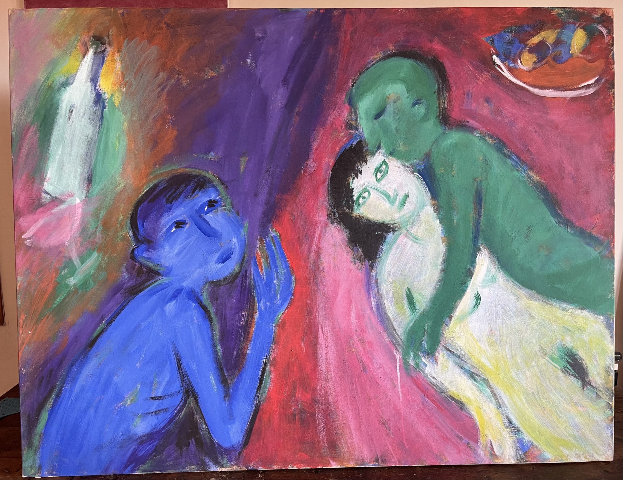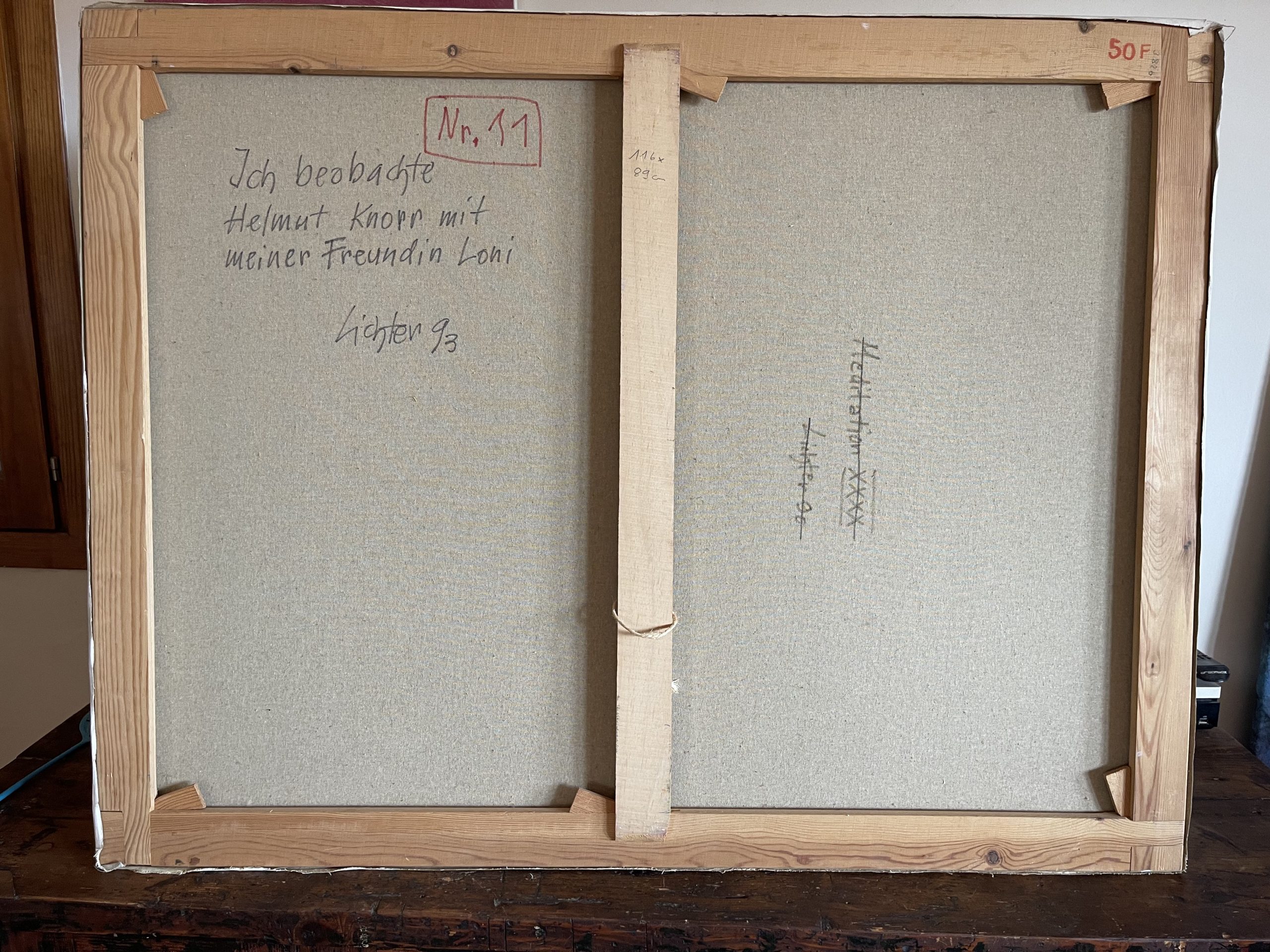 Dieses Werk aus dem Jahr 1993 dokumentiert Alfred Lichters Sinn für Beobachtung und zwischenmenschliche Szenerien. Die Darstellung zeigt Helmut Knorr mit seiner Partnerin Loni in einer Momentaufnahme, bei der Gestik, Haltung und Blicke mehr verraten als Worte. Lichter fängt Stimmung und Beziehung durch Farbnuancen und Komposition ein – ein intimes, nicht gestelltes, aber künstlerisch aufgeladenes Bild.