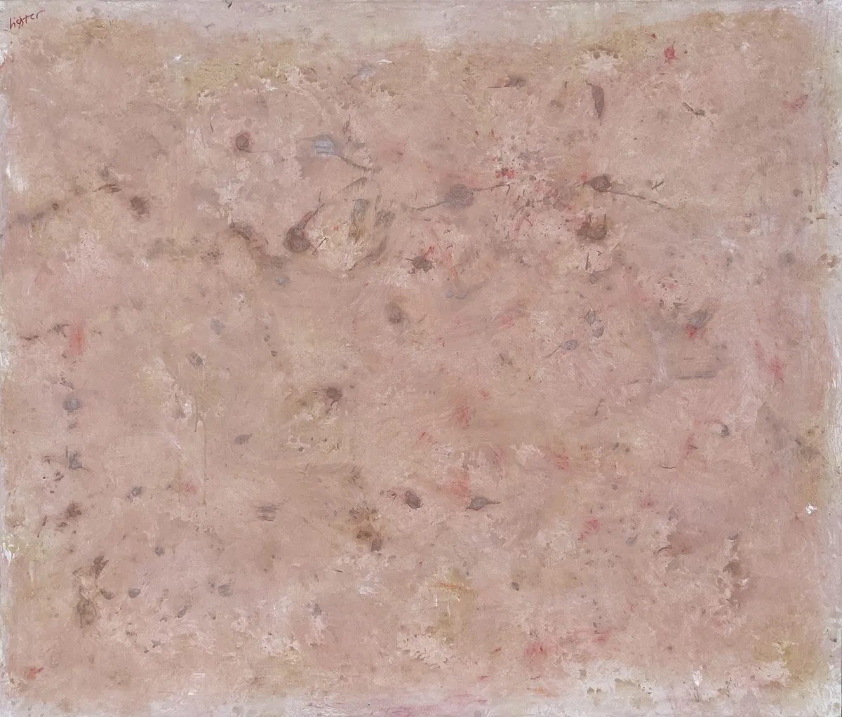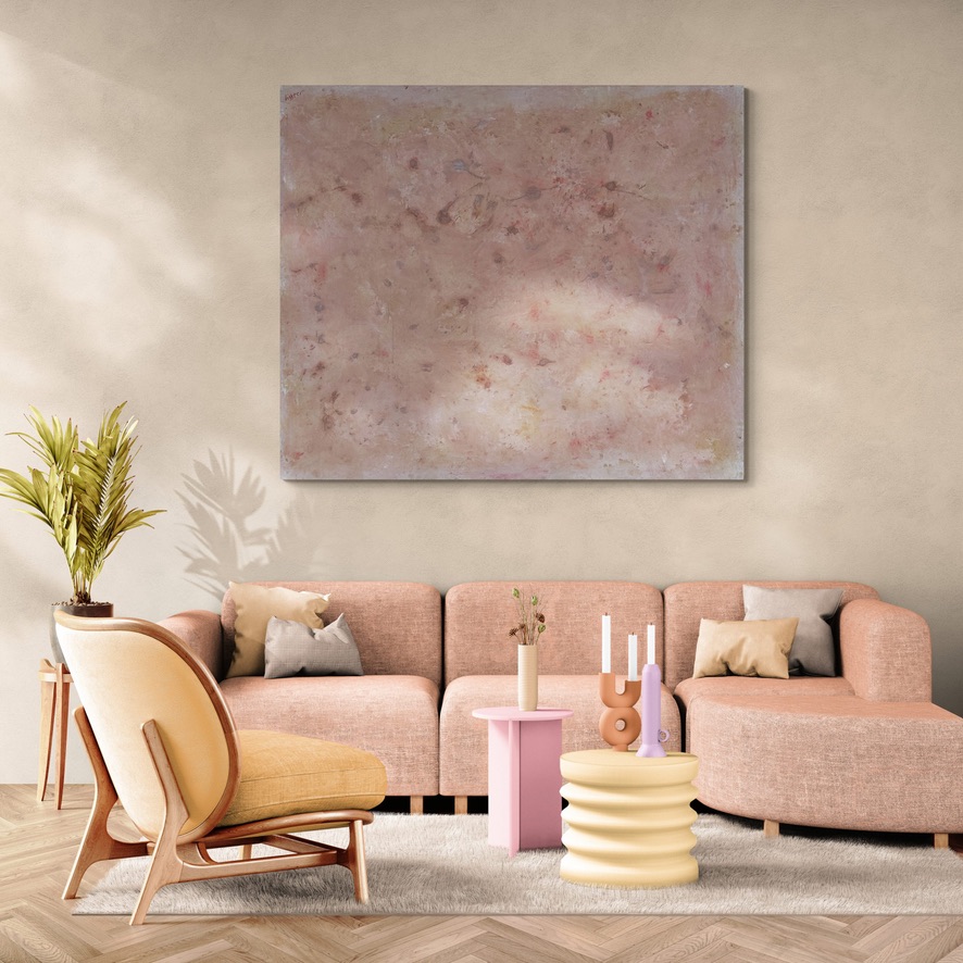Öl auf Leinwand, signiert, Einzelstück aus dem Nachlass. Diese Arbeit lädt zur kontemplativen Betrachtung ein und wirkt wie eine visuelle Einladung zum Innehalten. Ideal für Räume, die Achtsamkeit und Ruhe fördern. Dieses Gemälde entstand im Jahr 2012, kurz vor dem Tod des Künstlers. Er war da bereits 95 Jahre alt. Es hat eine Größe von 200 cm × 170 cm. Ein abstraktes Gemälde einer hellrosa Marmoroberfläche mit kleinen Flecken und Sprenkeln im Stil von Mark Rothko, unscharfe Ränder, blasse, gedämpfte Farben, sanfte Beleuchtung.