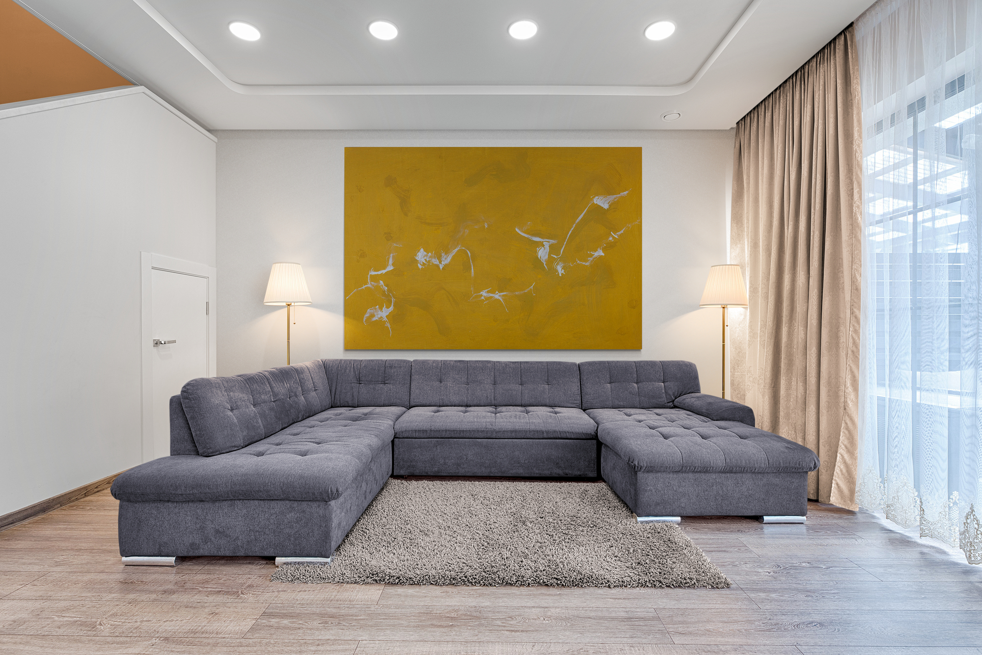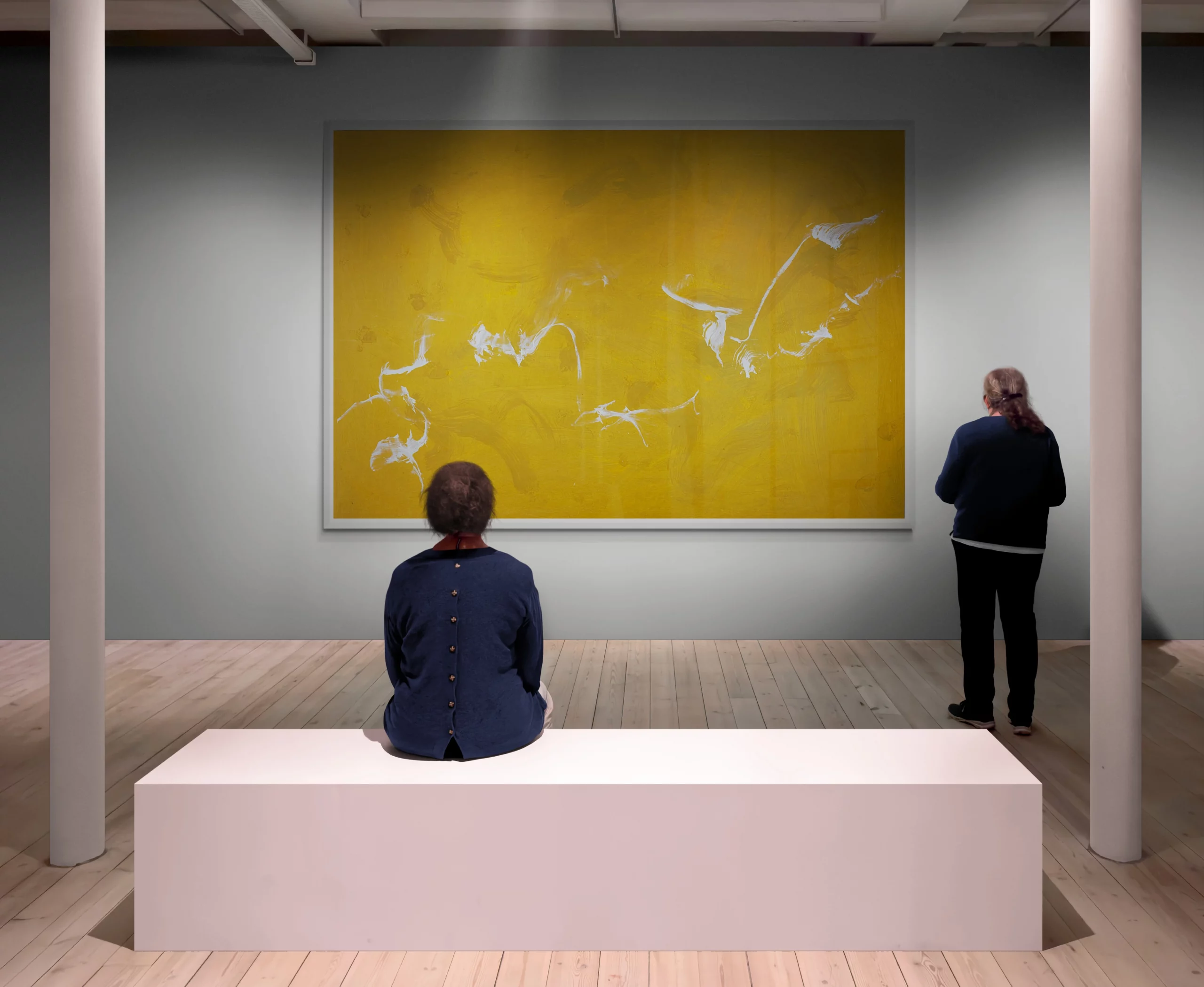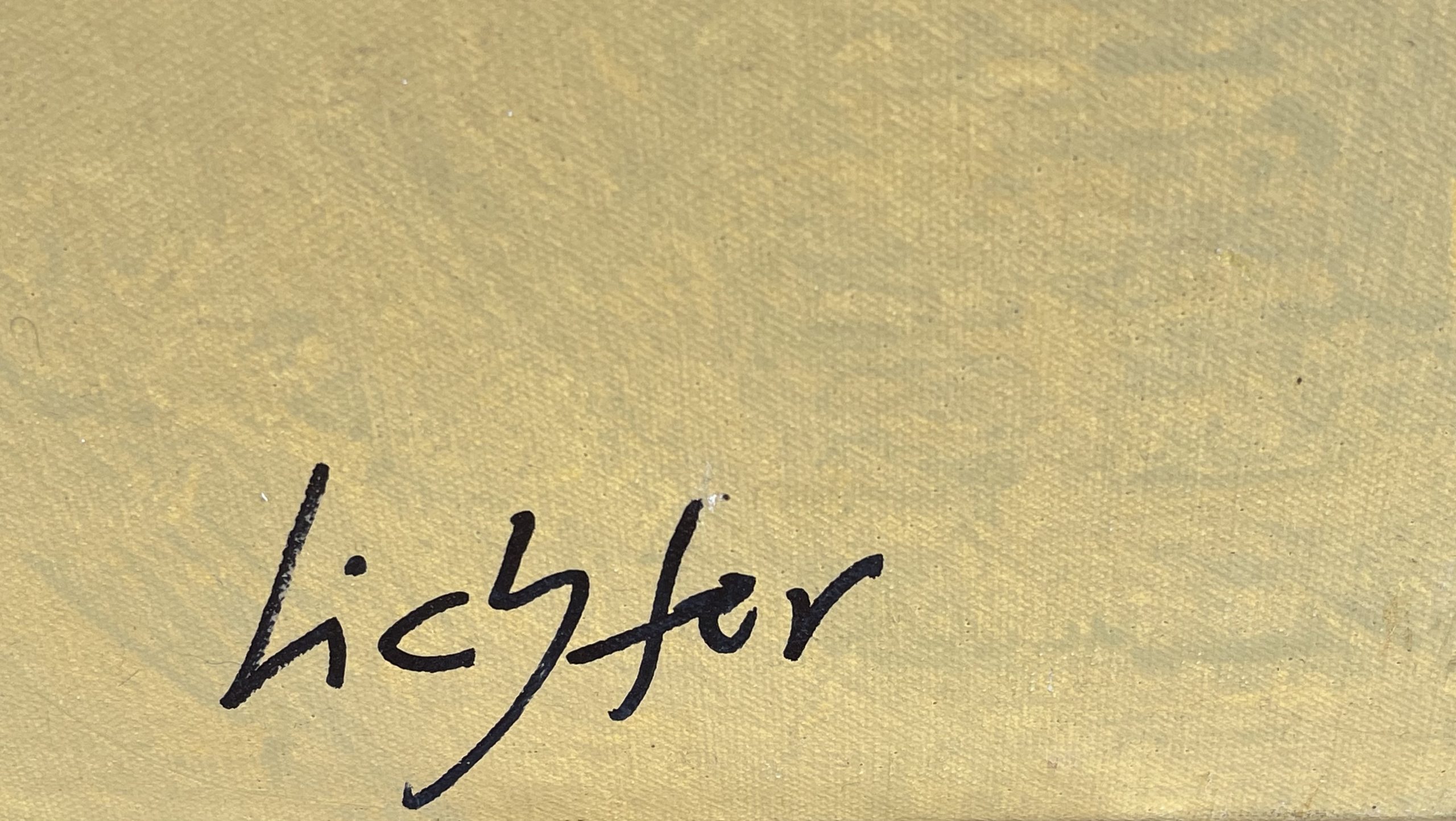 Das monumentale Werk „Constellation C. Deo“ gehört zu den großformatigen Highlights im Spätwerk von Alfred Lichter. Ein minimalistisches und geheimnisvolles Gemälde mit einem abstrakten gelben Hintergrund, auf dem weiße Formen zu sehen sind, die kleinen Vögeln ähneln, die vor dem Himmel fliegen, und das Geheimnisvolles und Nostalgisches hervorruft. Der XL-Maßstab verstärkt die immersive Wirkung, sodass der Betrachter beim Eintreten in den Raum fast physisch in die Komposition hineingezogen wird.