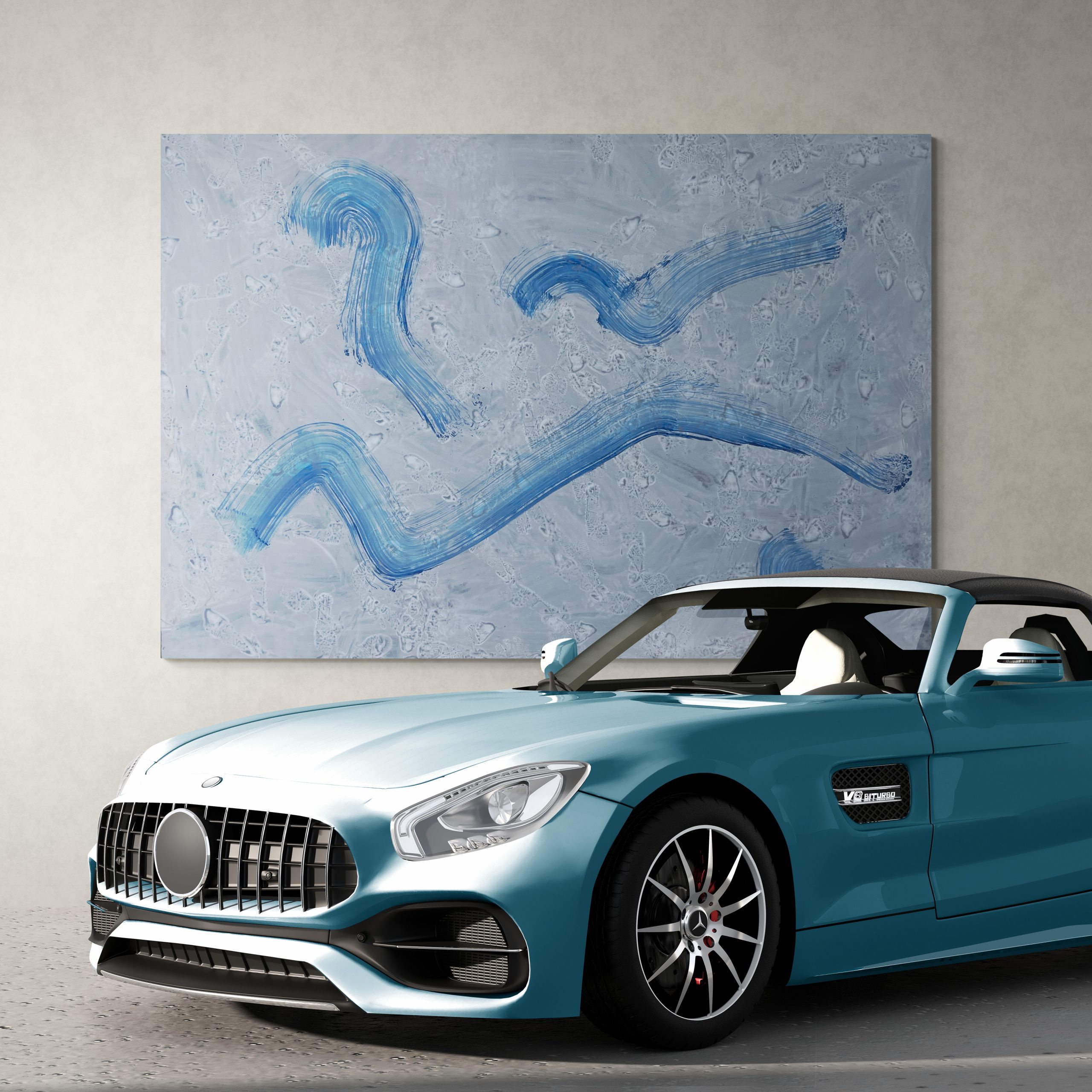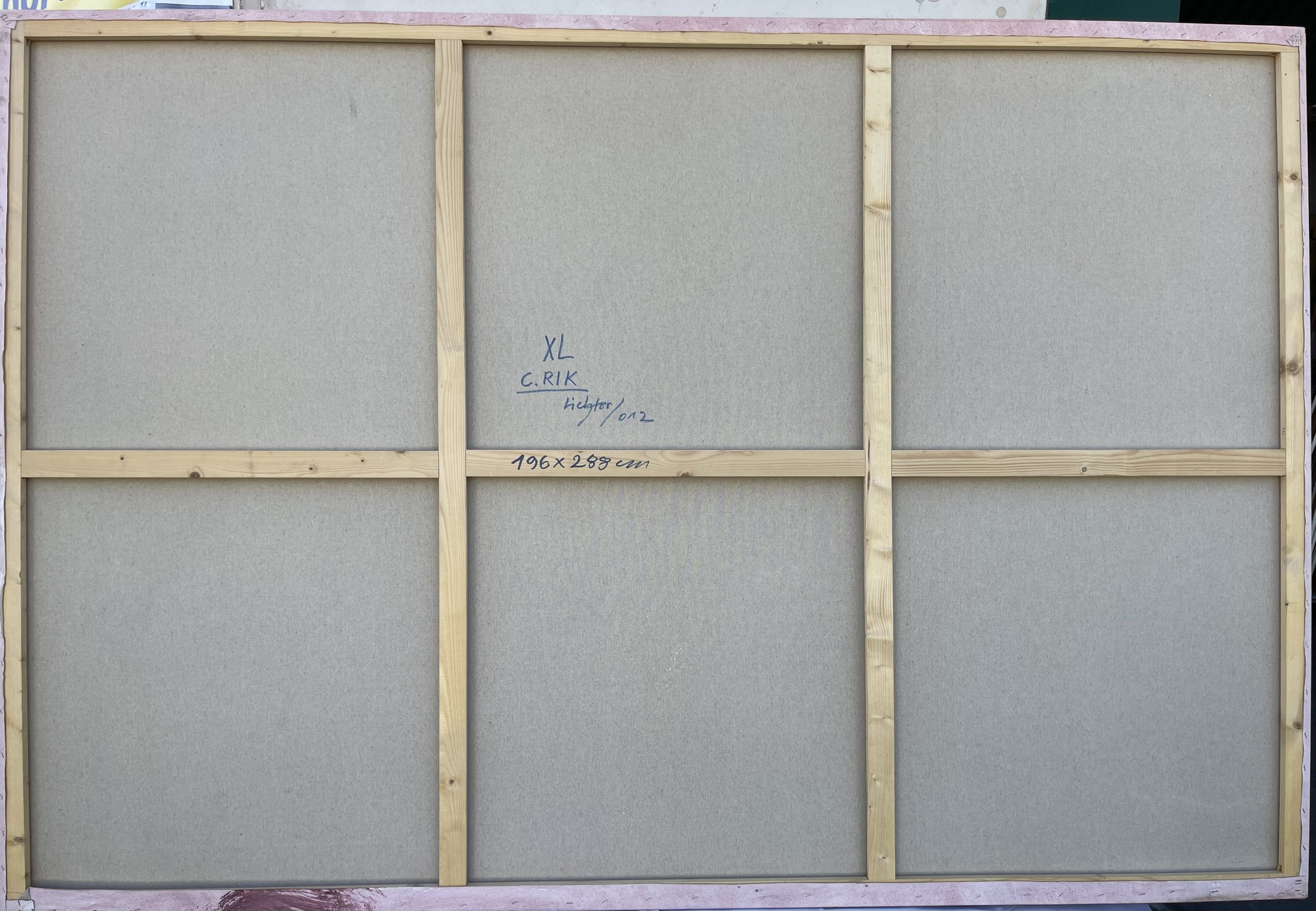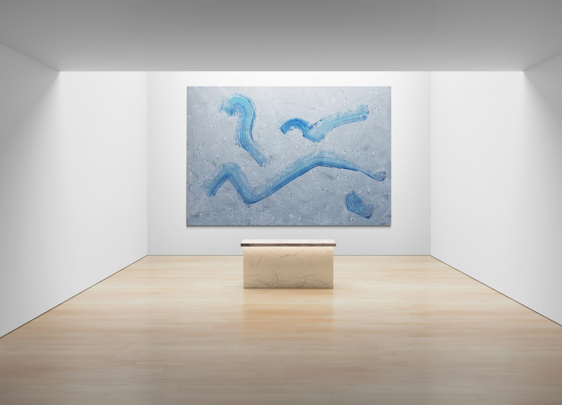 „Constellation Kir“ ist ein mutiges Stück innerhalb der XL-Serie, geprägt von tiefem Blau und blauen Untertönen. Die Farbkombination wirkt kraftvoll und leidenschaftlich, bleibt aber durch die geometrische Gliederung kontrolliert. Ein Gemälde mit zwei blauen Wellenlinien auf eisigem Hintergrund. Das Element Wasser wird durch wirbelnde Formen und Muster um diese Kurven herum dargestellt. Der Stil ist minimalistisch und konzentriert sich mehr auf die Form als auf Farbe oder Details. Es hat eine gewisse Textur, die das Gefühl von Bewegung und Fluidität verstärkt. Ein Blickfang für repräsentative Räume, Öl auf Leinwand, signiert. Dieses Gemälde entstand im Jahr 2012, kurz vor dem Tod des Künstlers. Er war da bereits 95 Jahre alt. Es hat eine Größe von 288 cm × 196 cm.